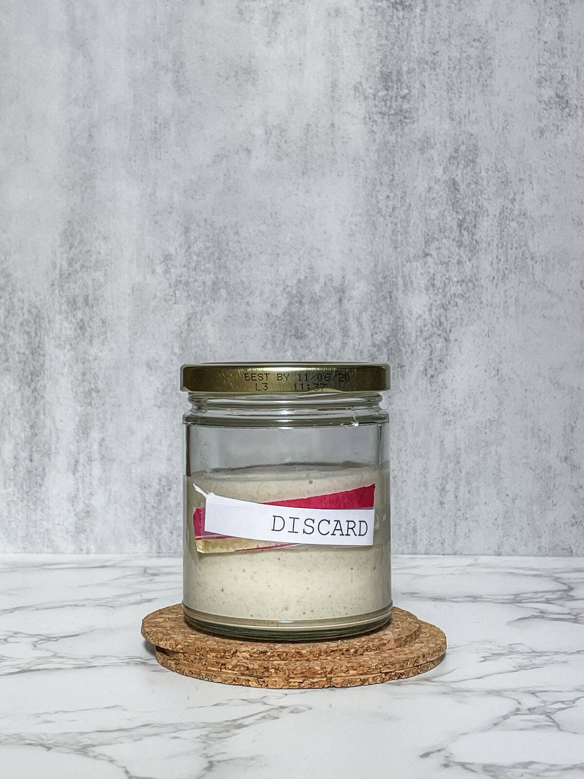First, feed a small amount of starter, even just 3-5 grams. You will have to throw away less if you feed a smaller amount. For example, feeding 5 grams of starter with a 1:4:4 ratio creates much less waste than feeding 20 grams at the same ratio.
